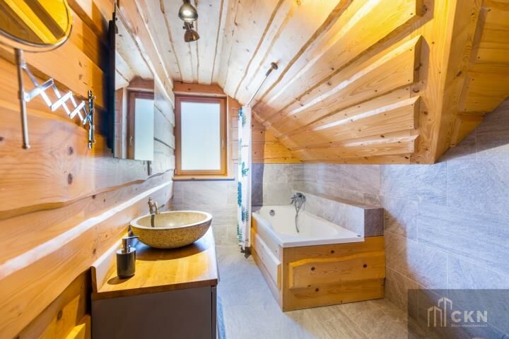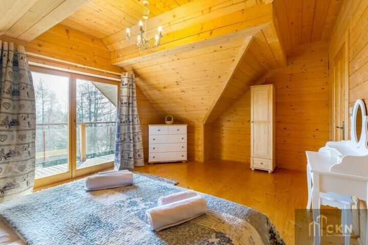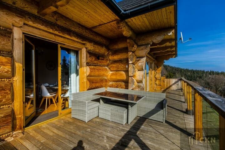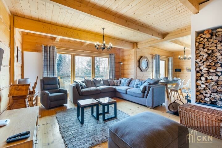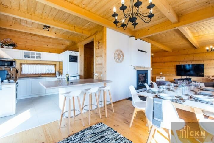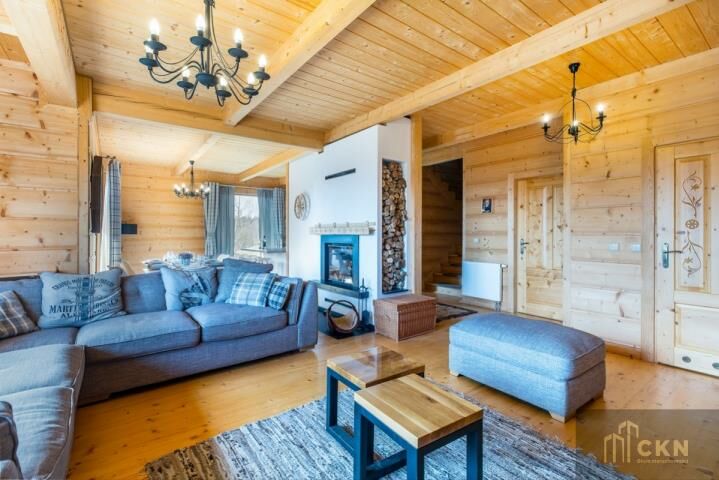 Powierzchnia domu wynosi około 200 m2 . Wnętrze wykończone w góralskim stylu z wysokiej jakości materiałów.