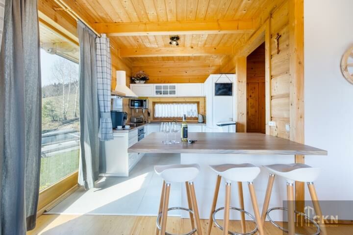 Wnętrze domu zachwyca swoim urokiem, zapraszając do relaksu w przytulnym salonie z ciepłym kominkiem, kuchni urządzonej z dbałością o każdy detal oraz przestronnym tarasem, gdzie można delektować się chwilą spokoju i piękna natury.